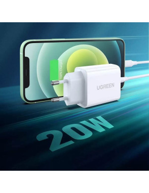 Încărcător compact Ugreen CD137 de 20W, cu port USB-C și suport Power Delivery 3.0, ideal pentru încărcare rapidă a smartphone-urilor și tabletelor.